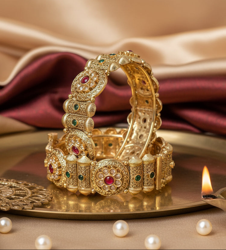 This exquisite bangle set is a fine expression of Kundan Jadau artistry, a traditional Indian jewellery technique revered for its intricate hand-setting of uncut stones within richly worked gold frameworks. Crafted with an 18K gold-plated finish, the design features ornate circular and cylindrical motifs, detailed filigree work, and textured gold elements that reflect heritage craftsmanship.